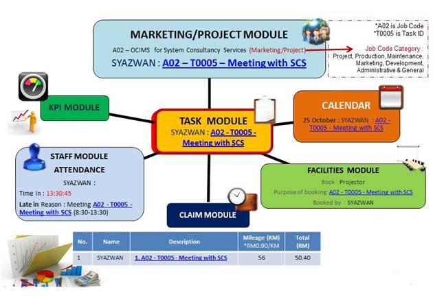 OCIMS is designed to have multiple accessibilities, working with all kinds of current technologies and readily adapted to work with future gadgets. OCIMS caters for desktop but it is BEST USE with mobile tablets such as the iPads or Android Tablets. It is touchscreen friendly with easy to navigate icons that makes you do things faster. Notification icon is readily available for discreet reminder but a Pop Up Message feature allows for important message to be displayed especially when in the office. It reduces the hassle of dialling numbers or looking for people around the office.